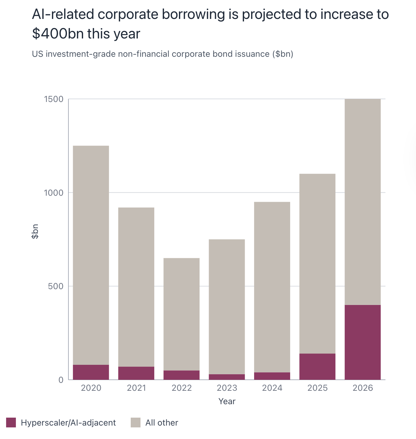 Until now, major borrowers in the US investment-grade corporate bond market have been mostly large banks and telecom firms, meaning creditor investors are largely insulated from shocks in the tech-dominated equity market. However, a notable change in the industry is taking place now. According to Apollo Global Management, by 2030, half of the 10 largest borrowers in this market will be hyperscalers, including Microsoft and Meta, who are building data centres to train and run their latest models. Evidently, credit markets are expected to play a key role in the development of AI assets, through enabling access to larger capital with the benefit of lower, fixed interest payments without restrictive covenants. The graph below (Figure 1) from Morgan Stanley estimates indicates there is a rapid increase in borrowing via fixed-income debt to finance this AI spending. In fact, looking more closely at the diagram, Morgan Stanley estimates that hyperscalers and their adjacent companies will raise $400bn from the US high-grade market this year - a sharp increase from the $170bn raised last year and $44bn in 2024.