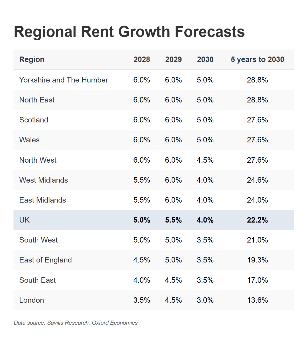 This is clearly expressed in the figure above, where London and the South East, known for their relative expensiveness, have less room for price growth; affordability remains central to the discussion. Moreover, Savills forecasts property values in the North West to sit just 15% below the national average, down from 30% in 2020. Meanwhile, average prices in London will fall from 70% above the average to merely 33%. This offers real insights to investors looking to purchase property, emphasising location rather than timing.
