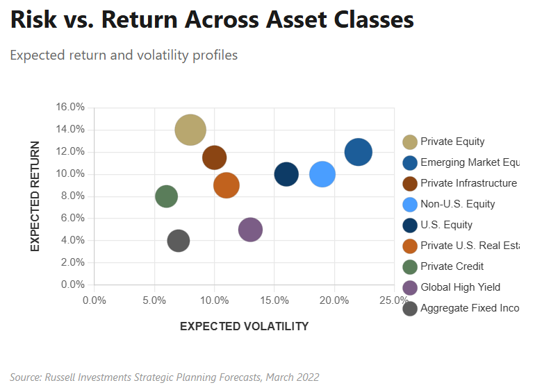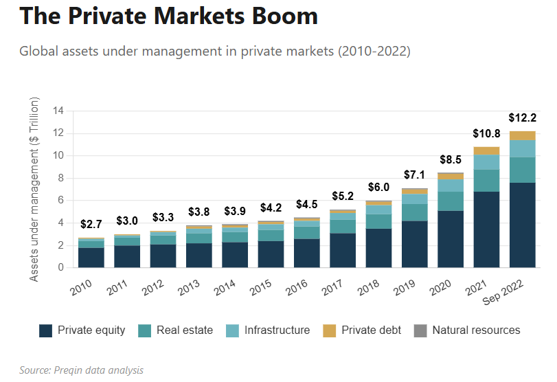 Private markets refer to investments in assets that are not listed on public exchanges. According to Russell Investments, this includes six main asset classes: private credit, private equity, venture capital, private infrastructure, private real estate, and natural resources. Due in large part to their high minimum capital requirements, long investment horizons, and illiquid nature, these assets have traditionally been predominantly within the focus of large institutional investors, including insurers and sovereign wealth funds. However, private markets have seen a great rise in appeal amongst a range of institutional portfolios in recent decades, with Inviva Investors reporting that “56 per cent now allocate ten per cent or more of their portfolios to Private Markets.” This trend has been driven primarily by the illiquidity premium, alongside the diversification benefits and broader opportunity set private assets can provide.