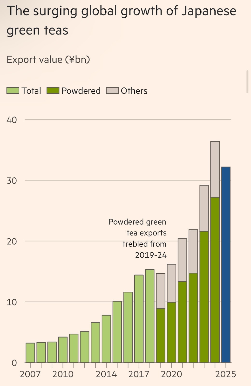 Japan’s exports of matcha were up 75% to ¥27bn ($177mn) in 2024 and have tripled since 2019. It has already exported twice as much in 2025 as it did during the whole of 2020. This booming demand should, in theory, be great for Japanese growth.